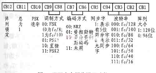 配置寄存器用于确定芯片的工作参数。配置寄存器也能以非接触方式编程,它由制造商在生产中进行编程。配置寄存器共有12位,其功能如图2所示。其中位11(CB11)总是为1。位10(CB10)用于设置PSK速率,置1时速率为FC/4,置0时速率为FC/2。当CB12为0时,表示存储阵列未被锁定;为1时表示成功地完成了接触编程或非接触编程,此时芯片工作于防冲突只读模式下。